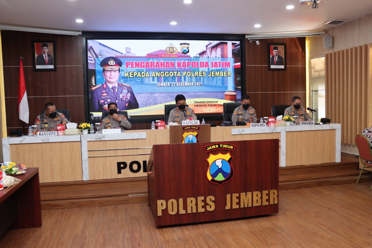 Setelah meresmikan gedung baru pelayanan spkt humas dan sat intelkam Kapolda Jatim memberikan arahan kepada ada anggota Polres Jember di aula Rupatama Polres Jember.